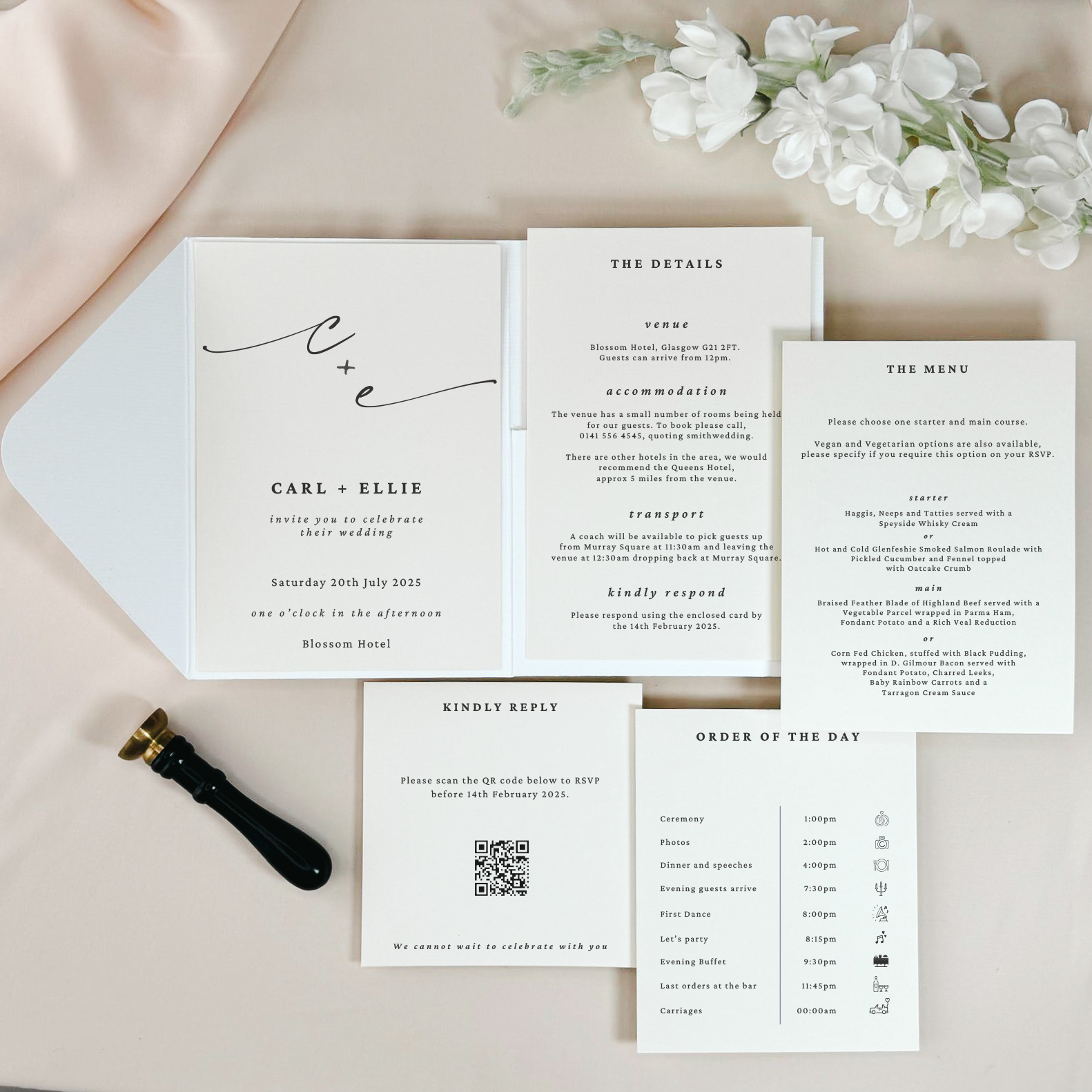 Introducing Grace, this pocketfold wedding invitation is the epitome of understated sophistication. Designed for couples who value both style and organisation, this suite pairs elegant modern typography with a delicate script monogram, presented in a structured pocketfold for effortless coordination.